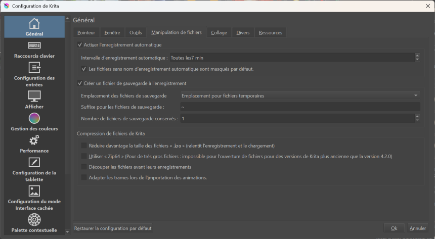 Le «Suffixe des fichiers de sauvegarde» est symbolisé par cette vague après l'extension du fichier associé à Krita pour le récupérer et le nommer ainsi. Au fur et à mesure de votre progression, «combien de fichiers de sauvegarde sont conservés» par défault 1 qui très bien.