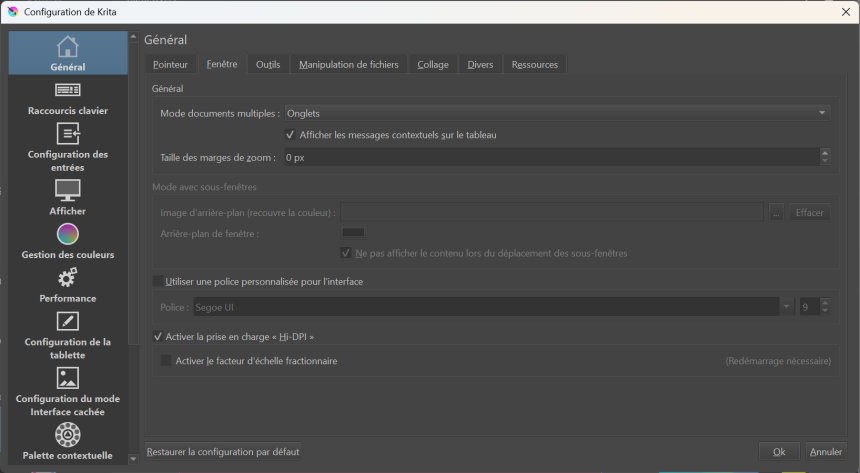 Comment l’utiliser ? Par défaut, l'outil «Activer le facteur d'échelle fractionnaire» est activé mais n'a aucun effet. Décochez-le et validez. Pour effectuer les ajustements, il est indispensable de redémarrer l'application. Aucun changement n'a été observé après le redémarrage. L'interphase par défaut est celle-ci. Si vous décidez de revenir à l'option et de la cocher, puis vous redémarrez Krita. Le logiciel va utiliser le Hi-DPI, et en mode plein écran, vous bénéficierez de la puissance de Krita pour une utilisation optimale. Cette astuce GameOvers est là pour vous.