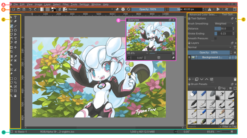 D -- Barre d'état -- Cet espace affiche votre préréglage de pinceau sélectionné, l'espace colorimétrique, la taille de l'image et fournit un contrôle de zoom pratique.