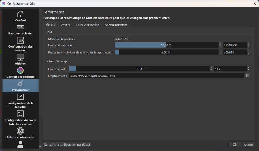 Passer les annulations dans le fichier tampon après : 2 %, ceci libère de la mémoire et stocke les annulations dans le disque dur sur un fichier. En dessous, limite de taille du fichier tampon à 4 Go et pour finir son chemin où Krita le stocke.